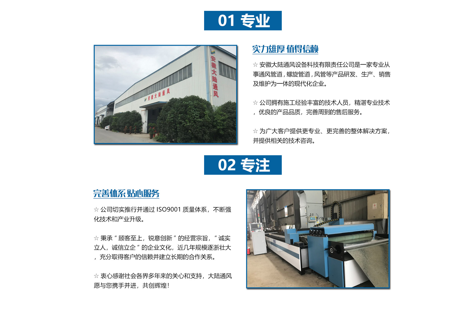 安徽大陸通風設備科技有限責任公司加工共板法蘭風管、螺旋風管、角鐵法蘭風管、插接式風管。價格合理。質量保障。是國內(nèi)生產(chǎn)和研究通風管道的企業(yè),工廠坐落于經(jīng)濟發(fā)達的安徽省合肥市。公司配備了好的自動化流水線設備和先進的制作安裝技術。